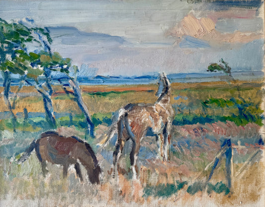 1930 Windy Day Horses Landscape Oil Painting in Gold Frame