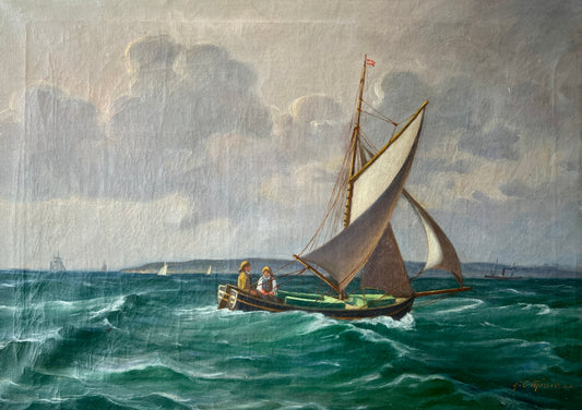 1924 Seascape with Sailboat Oil Painting in Gilded Wood Frame