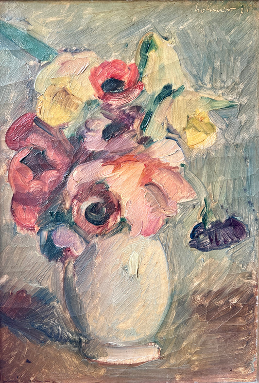 1925 Anenomes in Vase Floral Still Life Oil Painting in Original Gold Frame