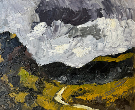 Moody Impasto Stormy Coastal Scottish Loch Mountain Landscape Oil Painting in Gold Frame