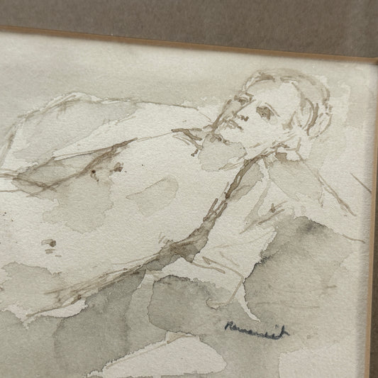 Seymour Remenick Nude Female Tonal Watercolor Portrait in Wood Frame