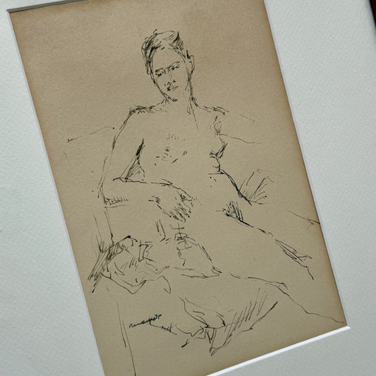 Seymour Remenick Nude Female Tonal Ink Portrait Drawing in Wood Frame