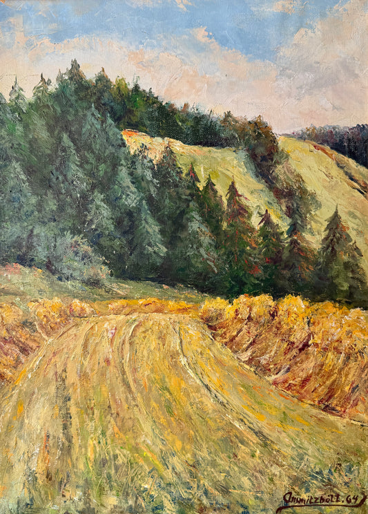 1964 Hillside Evergreen Landscape Oil Painting in Gold Frame