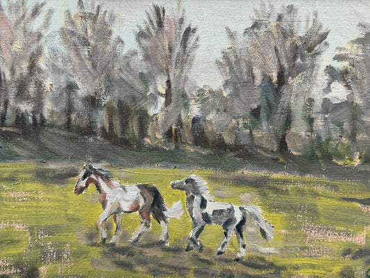 1965 Vintage Horse and Pony in Paddock Landscape Oil Painting in Gold Frame