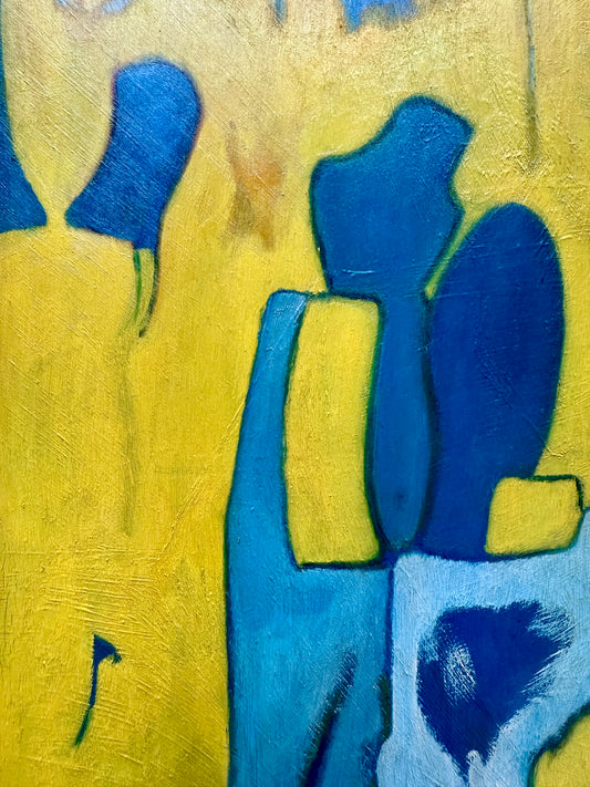1975 Blue and Yellow Figural Couple Abstract Oil Painting in Gold Frame