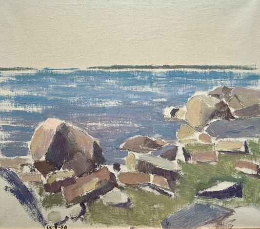 1956 Modernist Rocky Coastal Seascape Oil Painting in Gold Frame