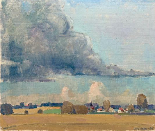 1978 White Clouds over Rolling Summer Fields Landscape Pastel in Pine Frame