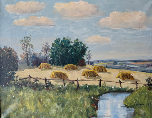 1959 Streamside Farm Landscape with Hay Bales Oil Painting in Gold Frame