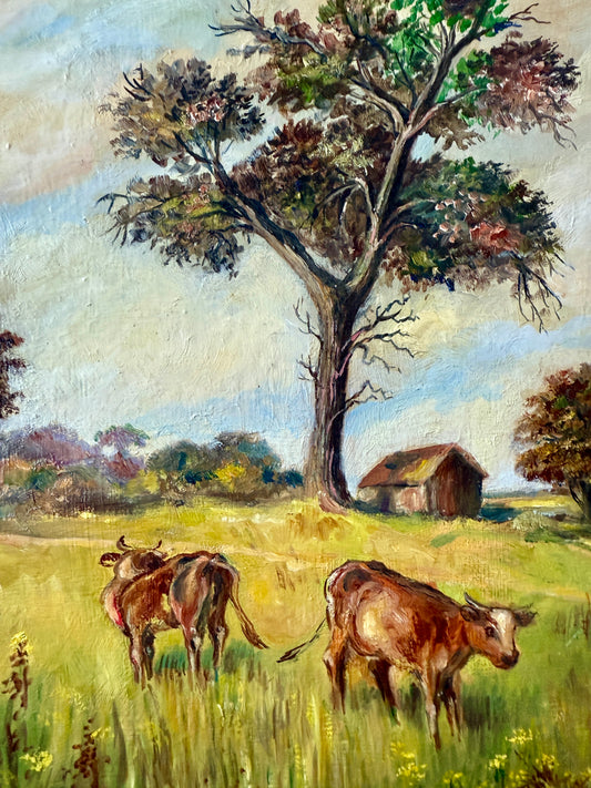 1958 Cows in Meadow Landscape in Gold Flowered Frame