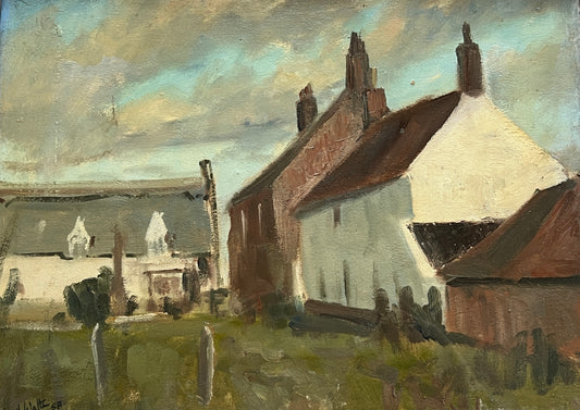 1958 L.J. Walton Small English Country Town Oil Painting in Gold Frame