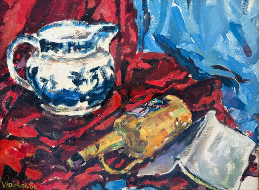 Victoria Donohue Antique Pitcher Blue White Still Life Oil Painting in Gold Frame