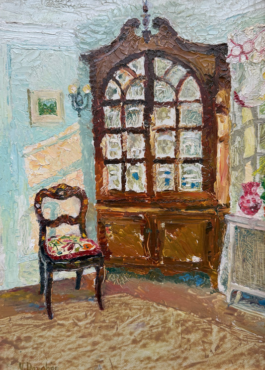 Victoria Donohue Corner Cupboard Living Room Interior Oil Painting in Wavy Gold Frame