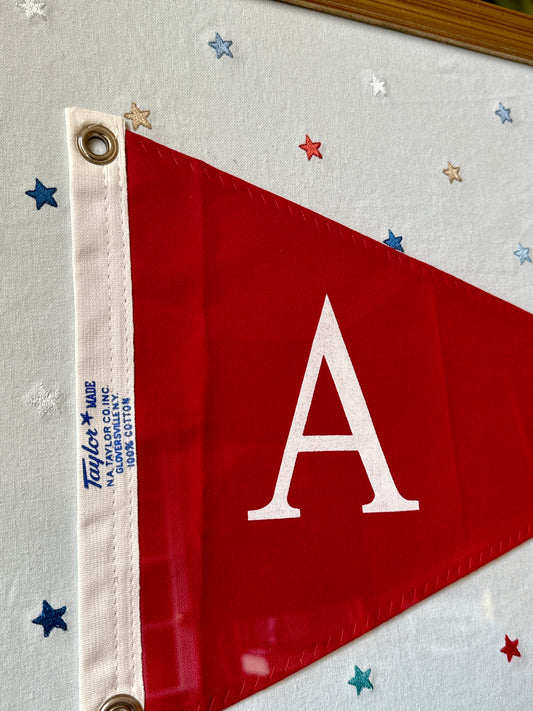 Vintage "A" Initial Canvas Burgee Nautical Flag on Red White Blue Stars in Gold Frame