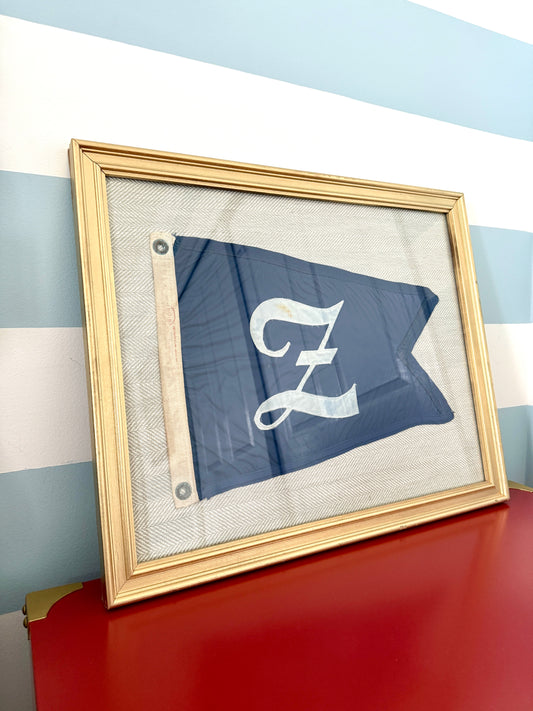 Vintage "Z" Nautical Yacht Flag on Tan Herringbone Fabric in Gold Frame