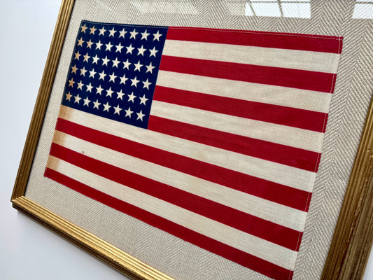 Vintage 48 Star American Flag on Tan Herringbone Fabric in Gold Frame