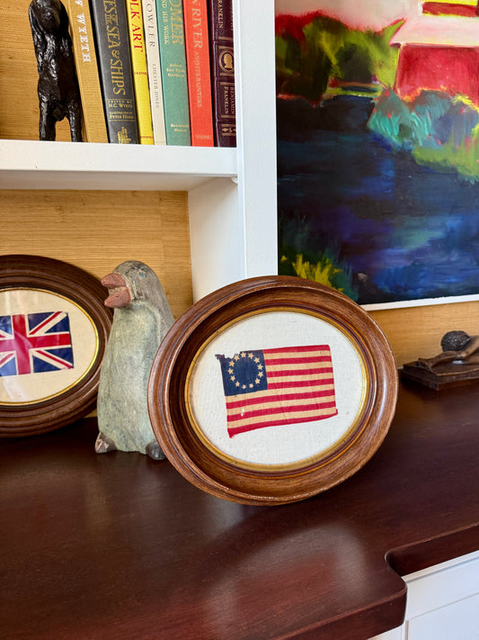 Vintage 13 Star American Betsy Ross Parade Flag on Duck Cloth in Antique Oval Wood Frame