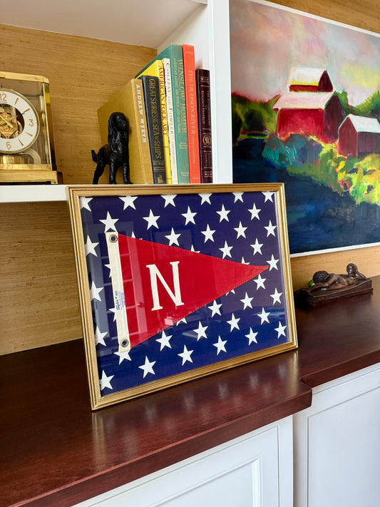 Vintage "N" Burgee Nautical Flag on Navy Star Canvas in Gold Frame