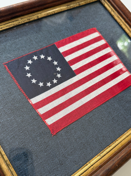 Vintage 13 Star American Betsy Ross Parade Flag on Blue Fabric in Antique Wood Frame