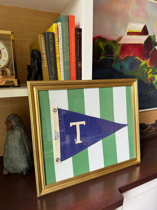 Vintage "T" Burgee Nautical Flag on Green Striped Canvas in Gold Frame