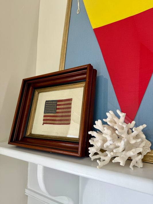 Vintage "T" Initial Canvas Burgee Nautical Flag on Red White Blue Stars in Gold Frame