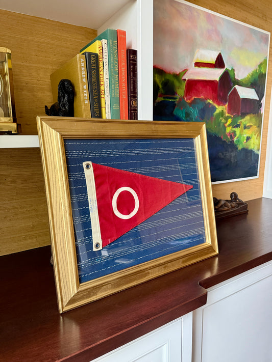 Vintage "O" Burgee Nautical Flag on Blue Chambray Fabric in Gold Frame