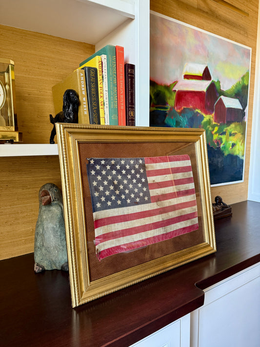 Vintage 50 Star American Flag on Faux Leather in Gold Frame
