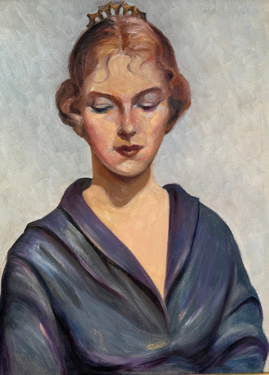 Vintage American Lady with Small Crown Portrait Oil Painting in Gold Frame