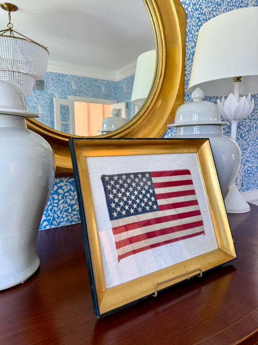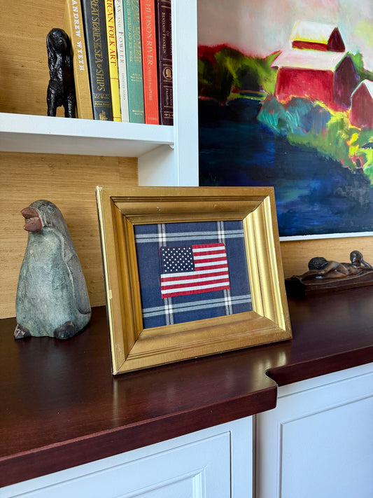 Vintage 50 Star American Parade Flag on Navy Windowpane Fabric in Antique Gold Frame