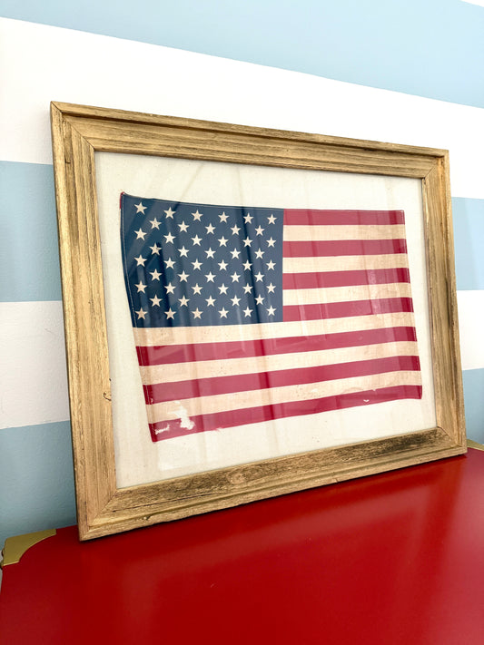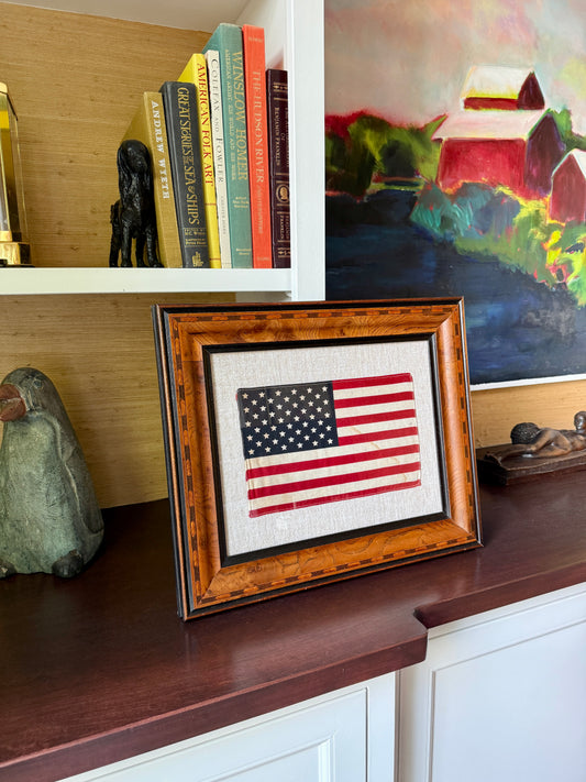 Vintage 50 Star American Flag on Natural Linen in Marquetry Wood Frame