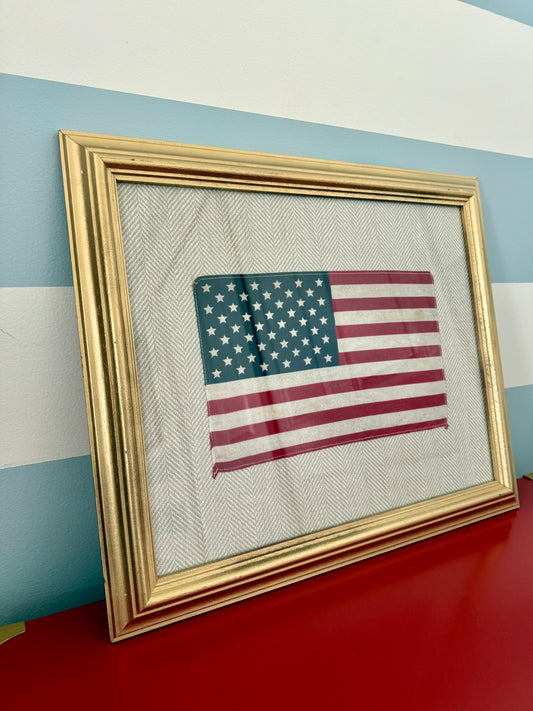 Vintage 50 Star American Parade Flag on Tan Herringbone Fabric in Gold Frame