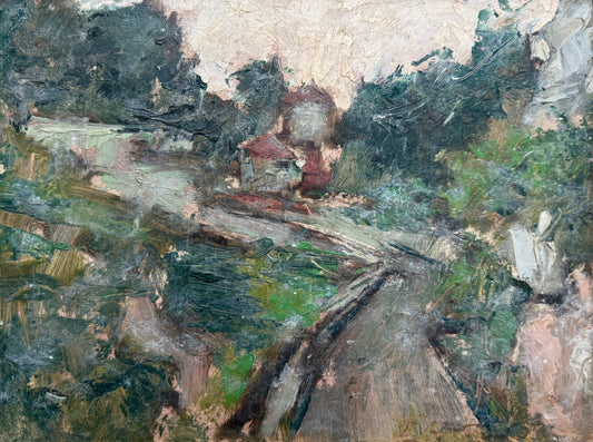 Vintage Abstract Country Road and Green Landscape Oil Painting in Gold Frame
