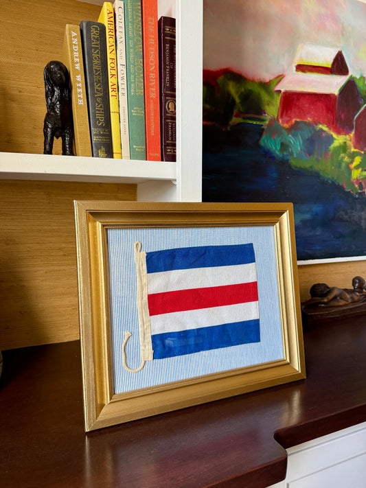 Vintage American Nautical "C" Signal Flag on Blue and White Oxford Striped Fabric in Gold Frame