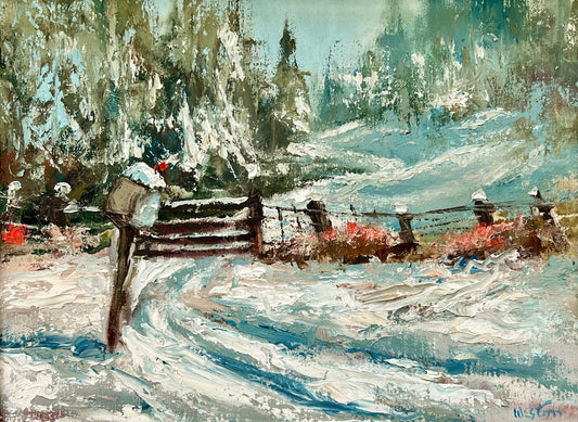 Vintage American Impressionist Snowy Mailbox Winter Landscape Oil Painting in Ornate Gold Frame