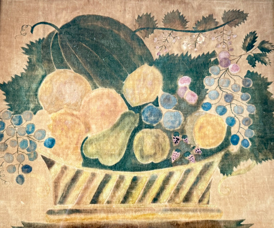 19th c. American Oil on Velvet Theorem Fruit Still Life in Massive Floral Frame