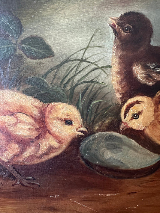 19th Century Chicks Eating From Oyster Shell Oil Painting in Original Gold Frame