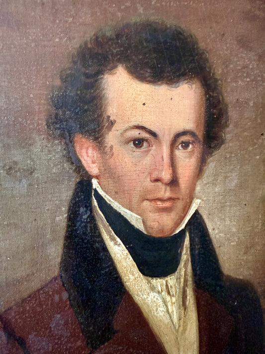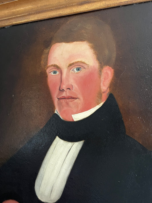 19th Century American Folk Portrait of a Young Man Oil Painting in Original Gold Frame
