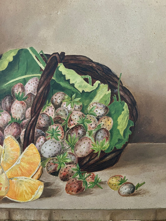 19th Century American Folk Art Still Life Sugar Cubes and Basket of Strawberries in Gold Frame