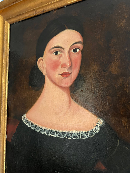 19th Century American Folk Portrait of a Young Woman Oil Painting in Original Gold Frame