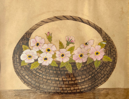 19th Century American Pink Flowers in Nantucket Style Boat Basket Folk Watercolor Painting