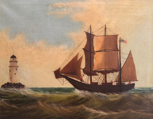 19th Century American Folk Ship Portrait in Seascape with Lighthouse Oil Painting in Wood Frame