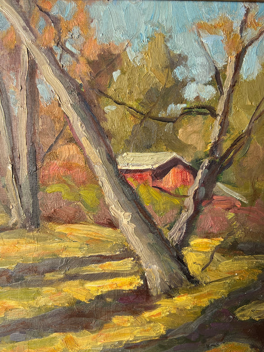 Vintage Impressionist Red Barn Landscape in Ornate Gold Frame
