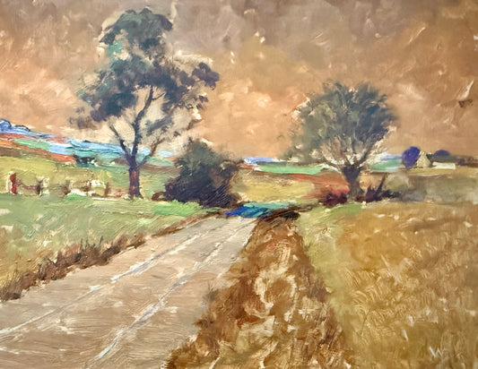 Vintage Impressionist Country Road Landscape Oil Painting in Gold Frame