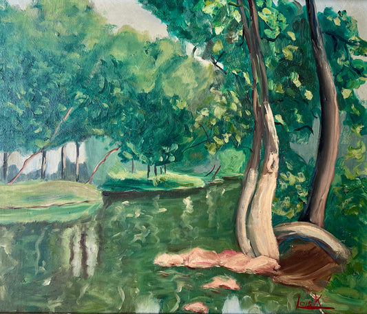 Vintage Impressionist Waterside Landscape Oil Painting in Gold Frame