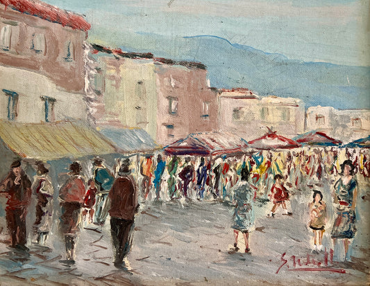 Vintage Impressionist Colorful European Street Market Scene Oil Painting in Gold Frame