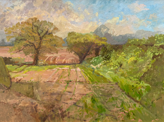 Vintage Impressionist Sunny Spring Farm Landscape Oil Painting in Gold Frame