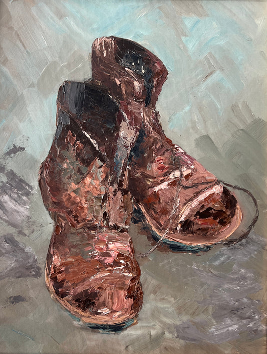 Vintage Impressionist Still Life of Brown Leather Boots Oil Painting in Gold Frame
