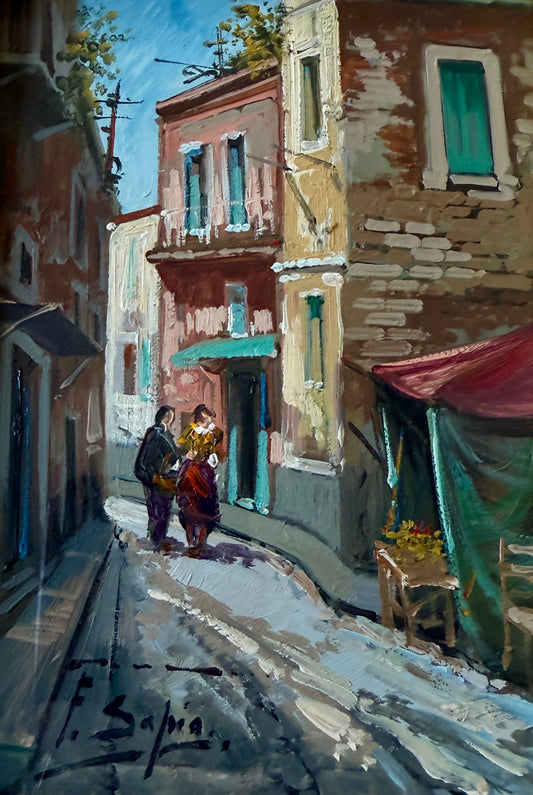 Vintage Italian Street Scene Oil Painting in Wood and Gilded Frame