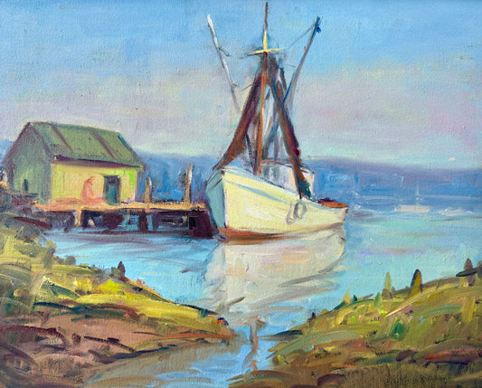 Vintage Impressionist Cape Ann Rockport, MA School Magic Hour Harbor Scene Oil Painting in Gold Frame