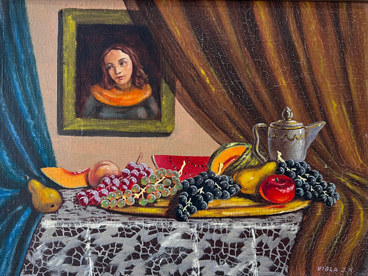Vintage Interior Still Life with Melons, Grapes and Female Portrait Oil Painting in Gold Frame