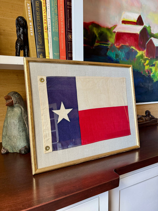 Vintage Lone Star Texas State Flag on Tan Herringbone Fabric in Gold Frame